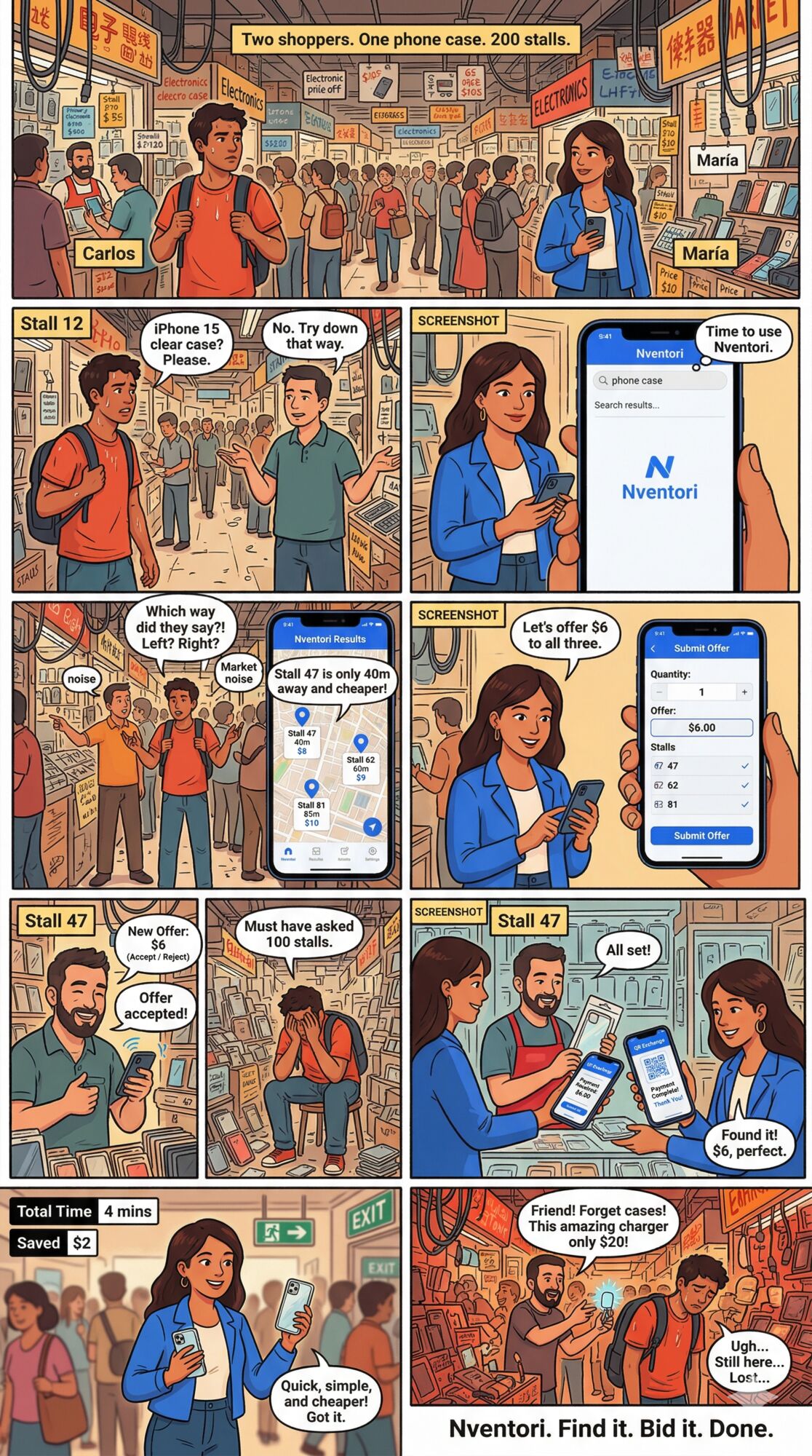 Nventori is a hyper-local inventory finder and bidding platform designed for dense retail environments like tech markets, bazaars, and multi-vendor shopping centers. Search for products by scanning barcodes, browse nearby sellers, compare prices, and negotiate deals — all from your phone.